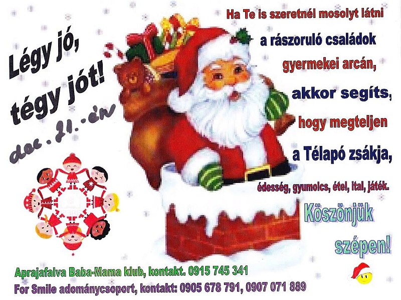 Nagycsaládosok és gyermeküket egyedül nevelő szülők Karácsonya! Aki szeretne hozzá járulhat bármivel, segítségeteket szívesen fogadjuk. Köszönjük szépen! Aprajafalva Baba-Mama klub és a For Smile adománycsoport nevében. Az adományokat a következő telefonszámokon egyeztetés után lehet eljuttatni a célcsoportokhoz. Mindenki segítségét köszönik a szervezetek. Segíts Te is, hogy mi is segíthessünk.