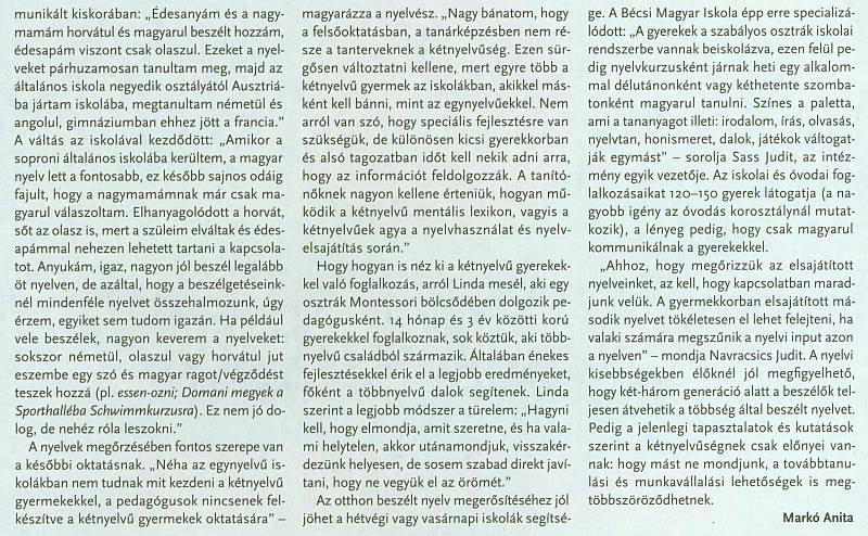 A Magyar Narancs decemberi számában közölte az alábbi cikket a kétnyelvűségről. Bár régiónk egyik gyakori élethelyzetéröl van szó, amely az asszimiláció kivédése szempontjából is létfontosságú, a témáról mi felénk - mint legtöbb fontos dologról - egyáltalán nem esik szó. Elvileg lenne műhely és szakember is, ahol és akik felválalhatnák a témát, valamiért ezt azonban nem teszik, úgy ahogy a múltban sem tették. A funkcionális kétnyelvüség helyett marad tehát a nyelvvesztés, na meg néhány véletlenszerű villanás a médiában...