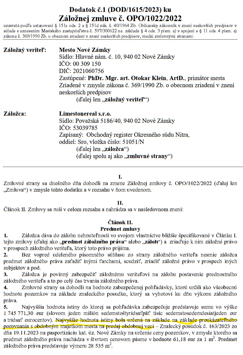 Tie isté pozemky v záložnej zmluve ocenené na 1.7 mil. Eur.