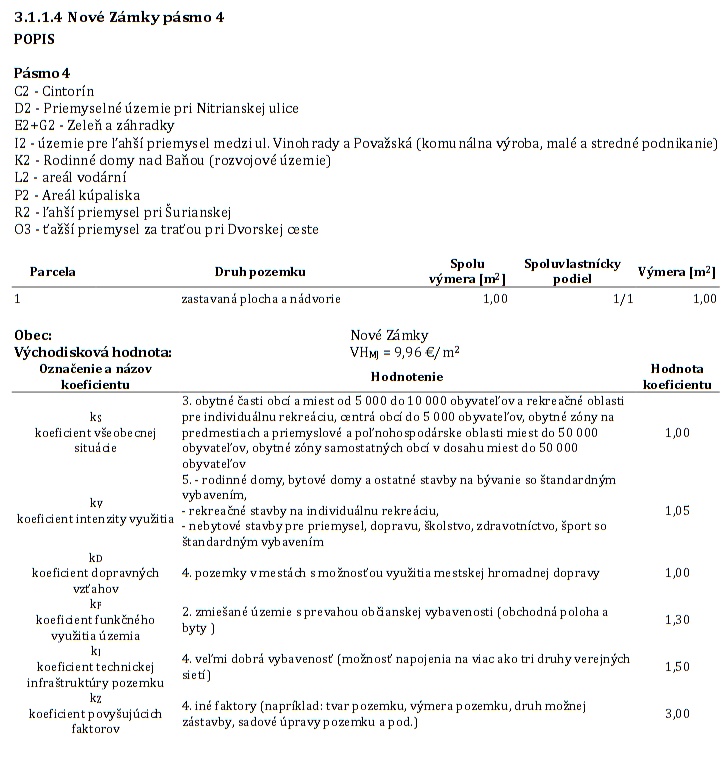 Fragment zo znaleckého posudku Ota Pisoňa na pasportizáciu k.ú. Nové Zámky na určenie ceny nájomného za mestské pozemky. Hoci sa pozemky pod skládkou neoceňovali a ani samotná skládka sa nenachádzala na pasportizačnej mape, zmluvným stranám to nebránilo, aby ocenili parcely pod skládkou zónovou cenou 4. pásma...