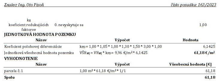 Znalec odovzdal posudok 19. novembra 2023, v ktorom v rámci 4. cenového pásma ocenil napríklad cintorín, priemyselné územie, zeleň a záhradky, územia pre ľahký priemysel, rodinné domy, areál vodární, areál kúpaliska, ľahší aj ťažší priemysel – nie však skládku TKO.