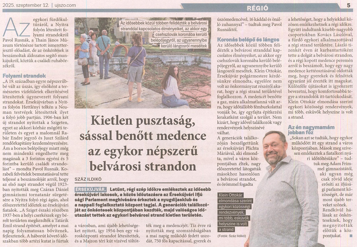 V článku redaktorka informovala o komentovanej prehliadke venovanej kedysi obľúbenému mestskému kúpalisku. Spomenula aktivity miestneho múzea, ktoré pripravilo  prednášku o vývoji plážových kúpalísk, ktoré vznikli v 19. storočí po regulácii rieky Nitry. V 50. rokoch 20. storočia bol v meste otvorený moderný kúpeľný komplex s bazénmi, kabínkami a sprchami, ktorý nadviazal na tradíciu starších riečnych kúpalísk.