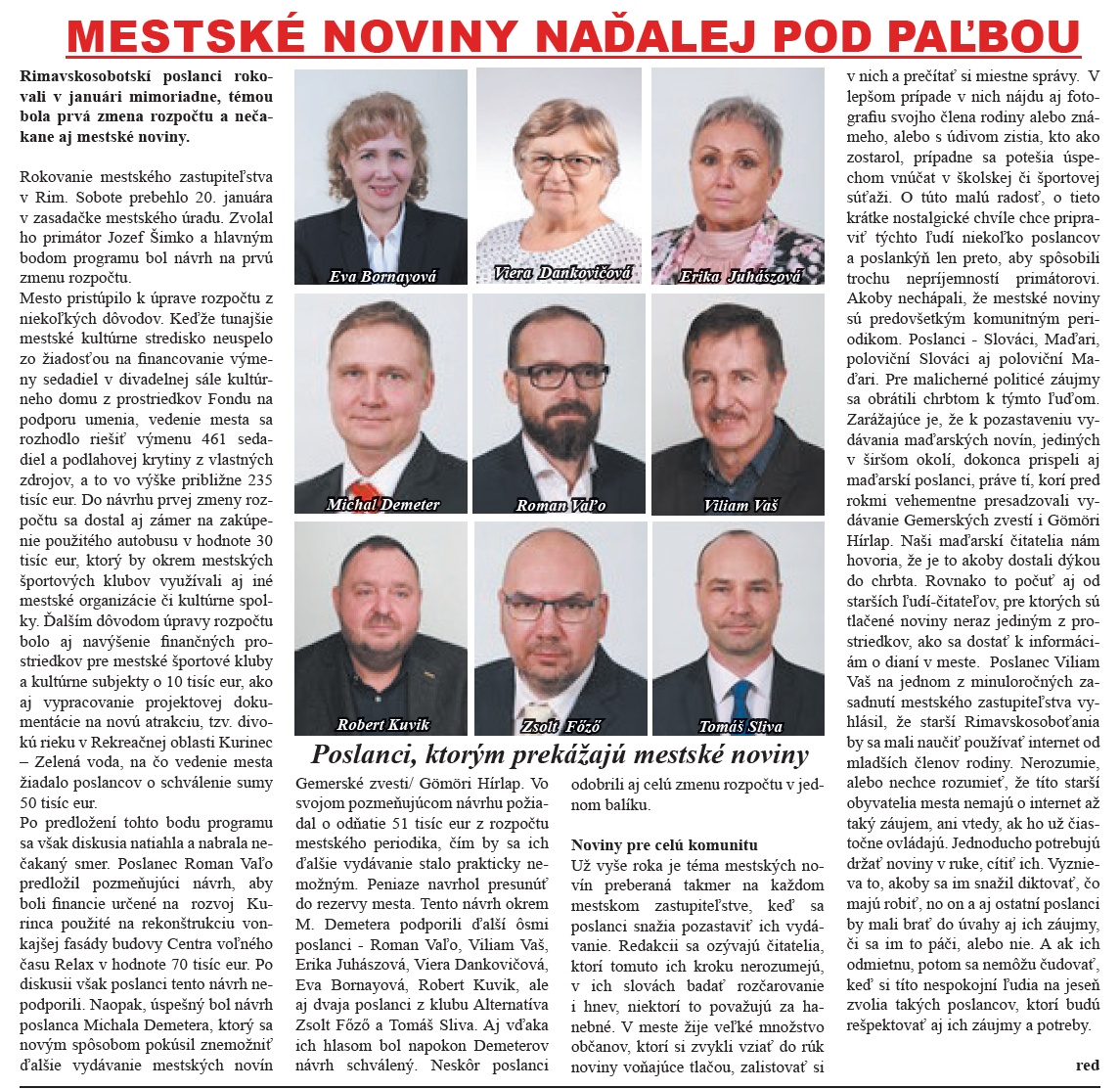 V Nových Zámkoch o Rimavskej Sobote nevieme takmer nič, pritom ide o kedysi prosperujúce mesto, ktoré sa podobne ako to naše ocitlo na periférii Európy. Od Nových Zámkov ho však odlišuje jedna pozoruhodná miestna konštanta – primátor Jozef Šimko. Tento skúsený politik, ktorý pred revolúciou pôsobil ako okresný policajný náčelník, riadi mesto od roku 2010 s neutíchajúcou horlivosťou aj dnes vo veku 75 rokov. Na konte má poslancovanie v krajskej samsopráve i v národnehj rade, ale v r. 2014 kandidoval aj v prezidenstkých voľbách. K jeho politickému výtlaku výrazne prispieva radničné periodikum Gemerské zvesti, ktoré v náklade 7 500 kusov putuje do domácností ako bezplatný mesačník. Noviny sa však ocitli v existenčnom ohrození, keď časť poslancov odhlasovala zrušenie ich rozpočtu 51-tisíc eur. Tento krok vyvolal u primátora a jeho priaznivcov vlnu rozhorčenia. Opozíciu dlhodobo podozrievali zo snahy umlčať vedenie mesta, najmä v citlivom období pred októbrovými komunálnymi voľbami. Primátor Šimko zachránil noviny tým, že uznesenie nepodpísal. Vo februárovom vydaní novín prešiel do protiútoku. Poslancov, ktorí hlasovali za zrušenie financovania novín, vystavil na akúsi „tabuľu hanby“ s ich menami a fotografiami, aby čitatelia sami posúdili, kto sa pokúsil o „atentát“ na ich prístup k bezplatným mestským správam.
