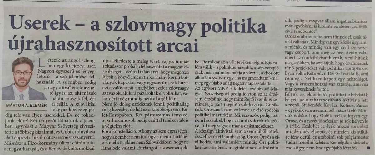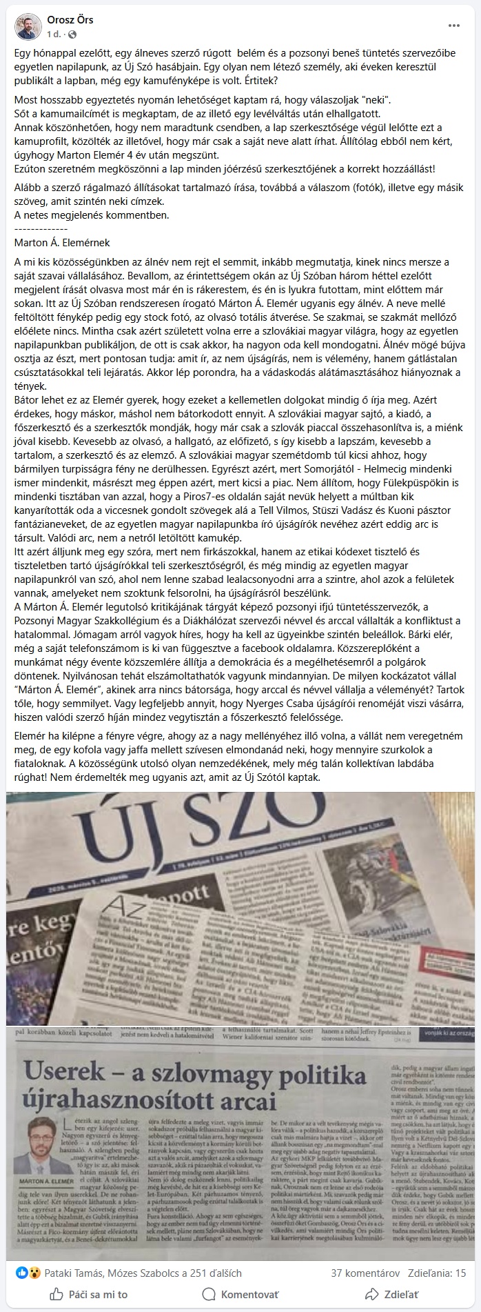 Van valami mélyen zavaró abban, amit az Új Szó tett. Az egyetlen szlovákiai magyar napilap éveken át közölt véleménycikkeket egy olyan szerzőtől, aki nem létezik. Márton Á. Elemér – mint kiderült – álnév. A mellette szereplő fénykép sem az övé volt, hanem egy internetről letöltött idegen arc. Az olvasót tehát átverték: akinek a véleményét olvassa, az nem is létezik – csupán egy gondosan felépített fikció. Orosz Örs felháborodása ezért érthető és jogos. A mi kis közösségünkben az újságírás nem csupán szakma, hanem küldetés. Ha valaki névvel ír, felelősséget vállal, elszámoltathatóvá teszi magát. Márton Á. Elemér mindezt megkerülte, és bújócskát játszott az olvasóival, amikor a jó erkölcsök nevében vonta felelősségre és támadta a célszemélyeket. Ez elfogadhatatlan, és Orosz Örsnek igaza van abban, hogy a felelősség – valódi szerző híján – a főszerkesztőt terheli. Márton Á. Elemért akár úgy is lehetne értelmezni, mint egy IPSO-hadműveletet, amely az olvasók megtévesztését és a vádaskodásért történő felelősségre vonás elkerülését szolgálta. Csakhogy itt bicsaklik meg Orosz Örs érvelése először: ha a cikkekért amúgy is a szerkesztőség perelhető, akkor az álnév valójában semmiféle jogi védelmet nem nyújtott – legfeljebb lehet, hogy a szerző gyáva. Vagy fél. Vagy egy csehszlovák kém. De innentől a kérdés már nem az, hogy ki írta. A kérdés az, hogy amit írt, igaz-e.
