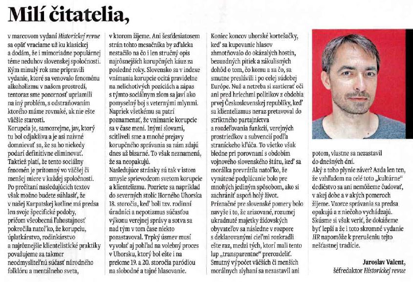 Historická veda na Slovensku si zaslúži, aby bola schopná klásť rovnako ostré otázky všetkým obdobiam – nielen tým, ktoré sú od nás najvzdialenejšie a v ktorých sa dá hovoriť o „cudzej“ nadvláde. Skutočne systémová korupcia – taká, ktorá je previazaná s centrom štátnej moci, s masovým transferom majetku a s politickým vylúčením celých skupín obyvateľstva – neprišla s uhorskými kortešačkami. Prišla s novým štátom, ktorý potreboval rýchlo vytvoriť lojálnu elitu a neváhal na to použiť akékoľvek prostriedky. Žiaľ propagandisti nemôžu ničím prispieť k potieraniu korupcie, keďže sami sú jej produktom...
