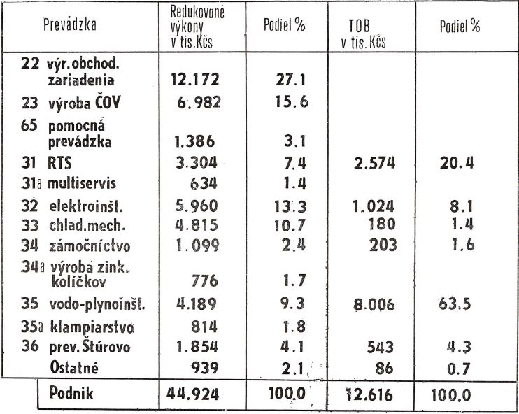 Hospodársky profil podniku na konci roka 1989 ukazoval diverzifikovanú štruktúru výkonov. Redukované výkony podniku dosiahli 44 924 tisíc Kčs a tržby od obyvateľstva za platené služby 12 616 tisíc Kčs. Najväčší podiel na výkone mala prevádzka 22 – výroba obchodného zariadenia – s hodnotou 12 172 tisíc Kčs, teda 27,1 % celkových výkonov. Nasledovala prevádzka 23 – výroba komponentov čističiek odpadových vôd – s 6 982 tisíc Kčs, čo predstavovalo 15,6 %. Významný podiel mali aj elektroinštalácie s 5 960 tisíc Kčs a chladiarenská mechanika s 4 815 tisíc Kčs. Z hľadiska tržieb od obyvateľstva dominovala vodo-plynoinštalácia s tržbami 8 006 tisíc Kčs, teda 63,5 % všetkých tržieb za platené služby. Rádiotelevízna služba tvorila 20,4 % a elektroinštalácie 8,1 %.