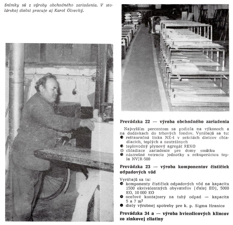 Nosný výrobný program podniku v roku 1988 tvorili reštauračná linka NZ-4, teplovodný plynový agregát REKO, chladiace zariadenia pre domy smútku a nástrešné vetracie jednotky s rekuperáciou tepla NVJR-500. Prevádzka výroby obchodného zariadenia bola najvýkonnejšou zložkou podniku. Dôležitosť rýchlo získavala aj výroba komponentov čističiek odpadových vôd, kde sa vyrábali zostavy pre kapacity 1500, 5000 a 10 000 ekvivalentných obyvateľov, ako aj oceľové kontajnery na tuhý odpad s objemom 5 a 7 m³ a diely výrobnej spotreby pre Sigma Hranice. Táto výroba sa začala od 1. júla 1986 a neskôr sa realizovala na novovytvorenej prevádzke, kde pracovalo 36 osôb. V roku 1986 boli vyrobené komponenty pre deväť čističiek s kapacitou 1500 EO, v roku 1987 pre štyri čističky s kapacitou 5000 EO a pre dve čističky s kapacitou 10 000 EO.
