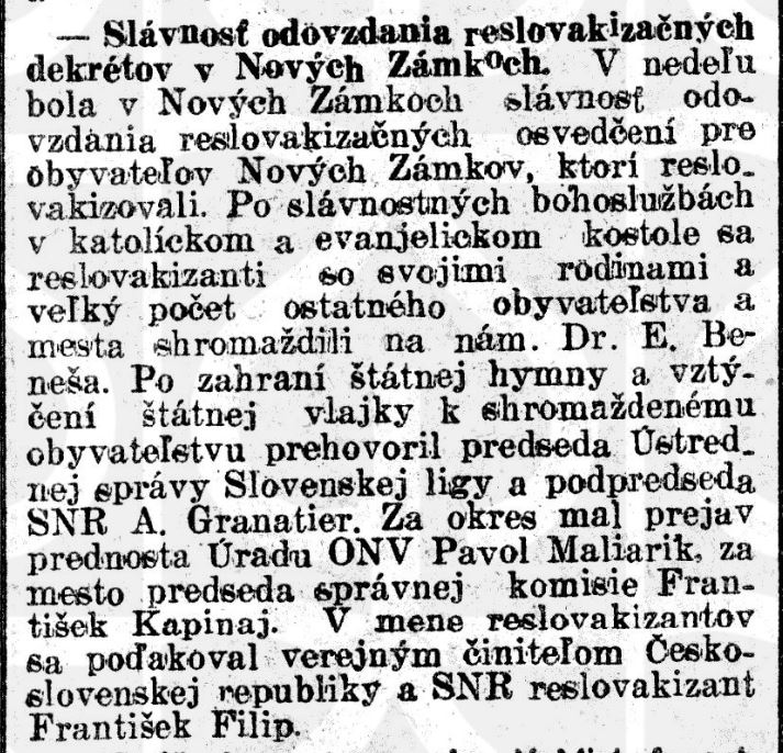 Režisér slávnosti v Nových Zámkoch robil to isté. Rozhodol, že nestačí zmeniť papiere v kancelárii. Treba námestie, hymnu, prejavy. A predovšetkým — treba poďakovanie. Niekto musí vstať a povedať: ďakujem. František Filip vstal a poďakoval. Nevieme ci sa prihlásil sám, či ho vybrali, alebo vyžrebovali. Bez neho by reslovakizácia bola len administratívnym násilím. S ním sa stala pornografickou inscenáciou, v ktorej je poníženie zabalené do formy slávnosti a obeť je nútená hrať rolu vďačného príjemcu. Aj novinový článok, z ktorého dnes rekonštruujeme udalosť, je čistá pornografia.