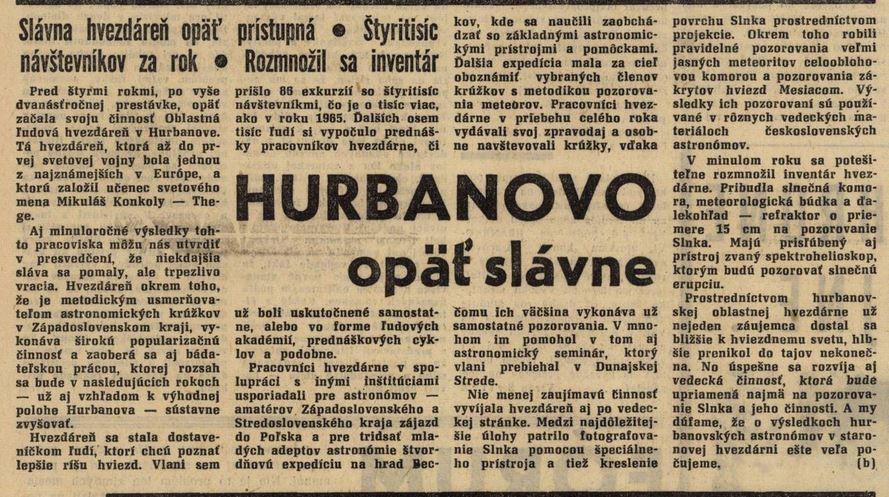 | 34 | 1967.01.26 | Hlas ľudu: Hurbanovo opäť slávne. Slávna hvezdáreň opäť prístupná. Štyritisíc návštevníkov za rok. Rozmnožil sa inventár doc |