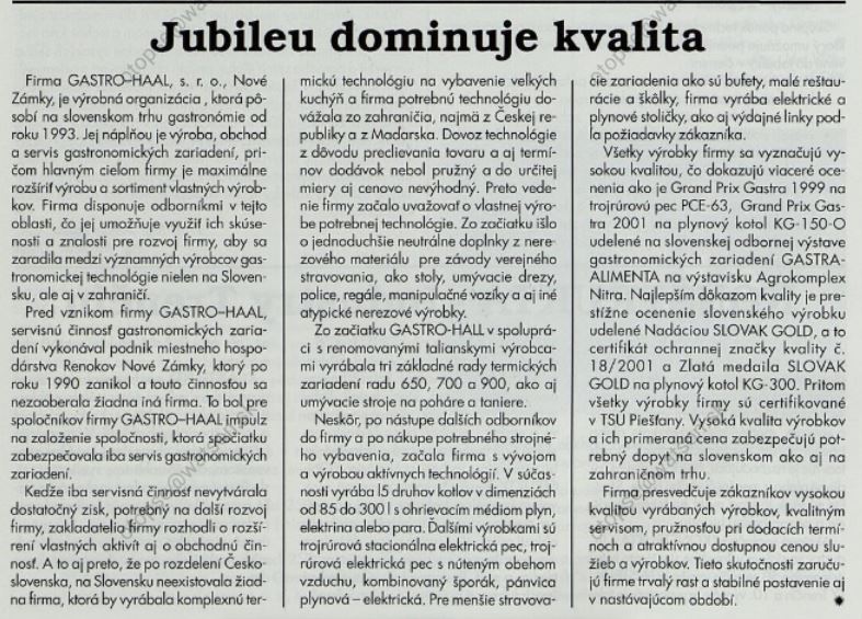 Spravodaj SOPK: Jubileu dominuje kvalita. Firma Gastro-Haal sro.