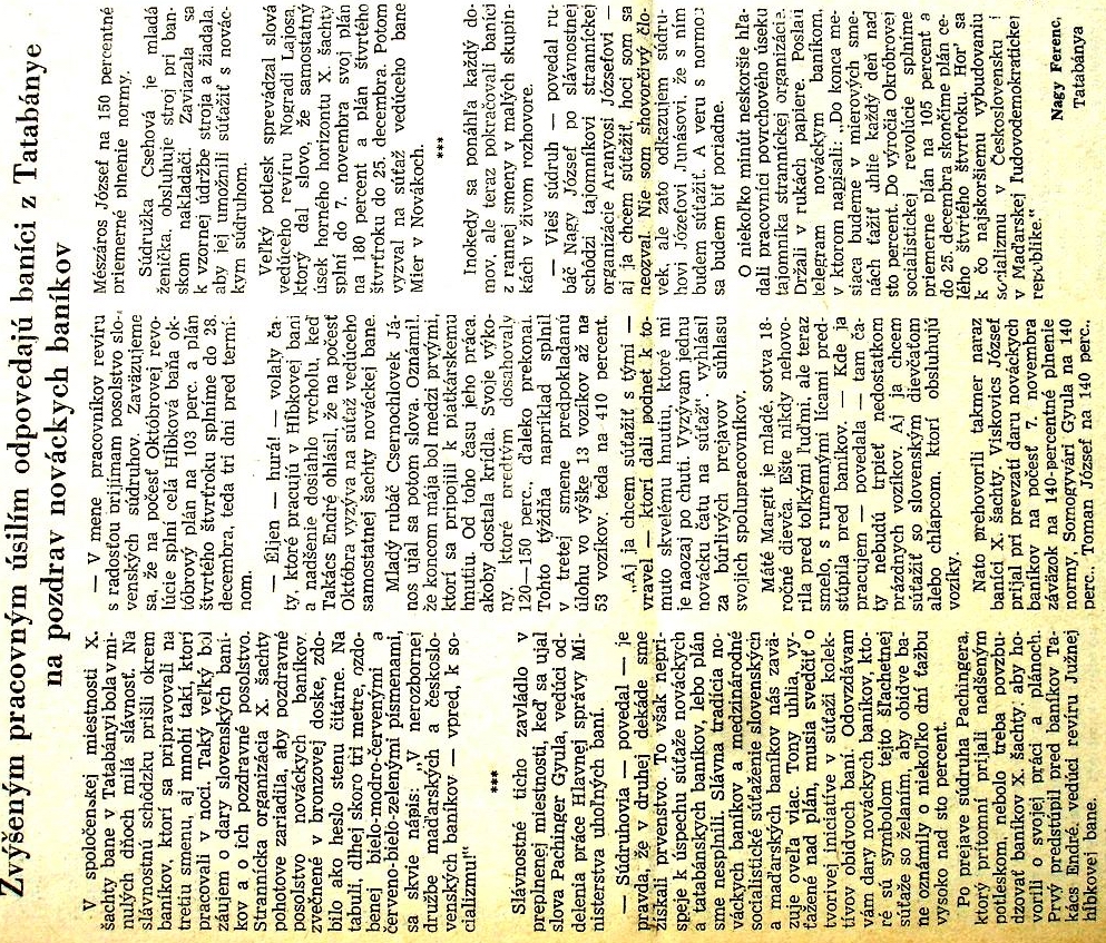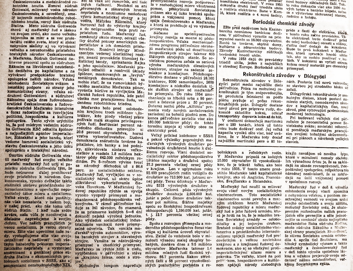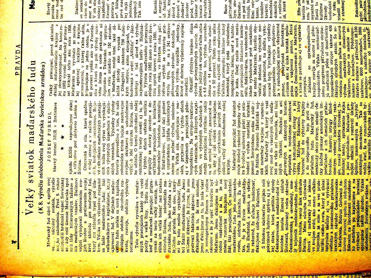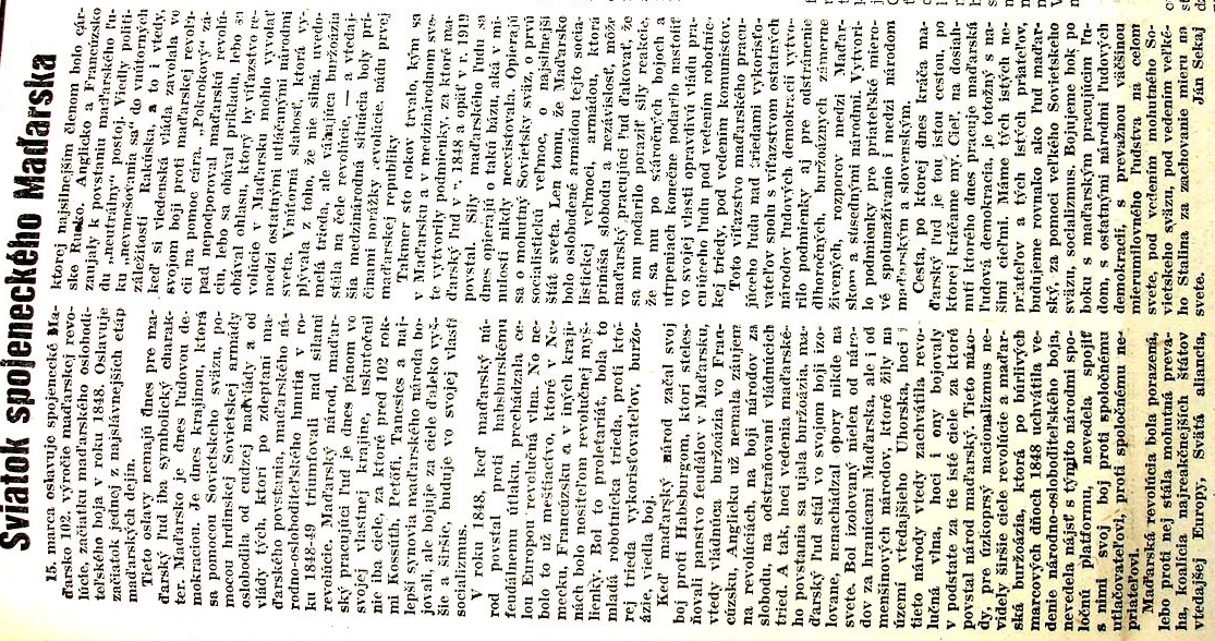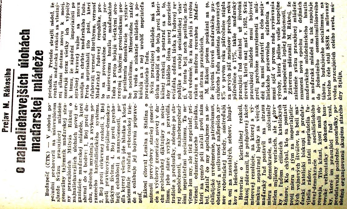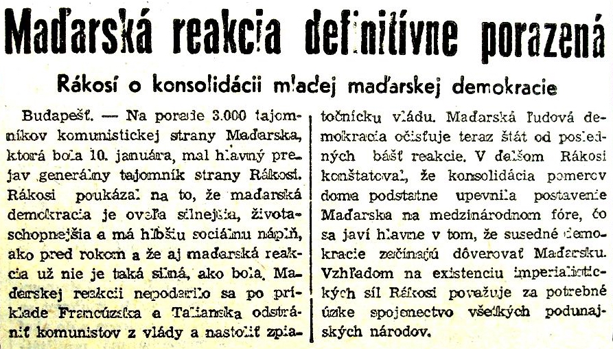 | 52 | 1945.03.17 | Дебрецен, 17 марта 1945 г., Из письма генерального секретаря Центрального руководства компартии Венгрии М. Ракоши заведующему отделом международной информации ЦК ВКП(б) Г. Димитрову о положении коммунистов-венгров в Чехословакии. В публикуемом фрагменте письма содержится информация о проблемах, возникающих у коммунистов венгерской национальности в Словакии, содержится просьба оказать влияние на словацких коммунистов с целью улучшения положения венгерского меньшинства. Венгерское национальное меньшинство в Чехословакии в контексте межгосударственных отношений Документы и материалы 1944-1951 гг. (М. РОССПЭН, 2017) Doc. 19 |