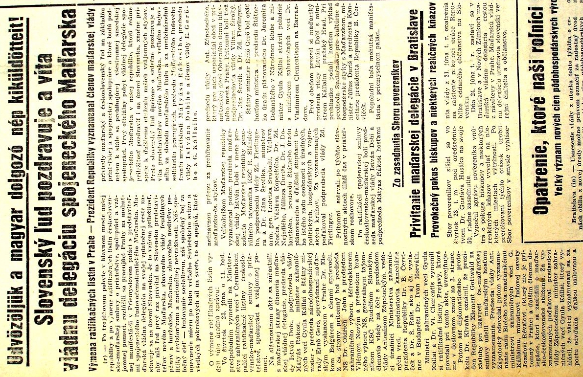 | 42 | 1945.02.27 | "Teljesülnek a szlovák parasztok évszázados vágyai". Az SZNT Elnöksége kiadja 4/1945 sz. rendeletét „a németek, a magyarok, valamint a szlovák nemzet árulói és ellenségei mezõgazdasági vagyonának elkobzásáról és haladéktalan szétosztásáról”, amely elrendeli többek között az 1938. november 1-jén csehszlovák állampolgársággal nem rendelkezõ magyarok összes, valamint az 1938. november 1-jén csehszlovák állampolgársággal rendelkezõ magyarok 50 hektárt meghaladó földtulajdonának elkobzását. Popély Árpád: A csehszlovákiai magyar kisebbség jogfosztottságának évei. Kronológiai áttekintés Polányi Imre, A szlovákiai magyarok helyzete 1944-1948 Dokumentumok, Pécs 1992, doc |