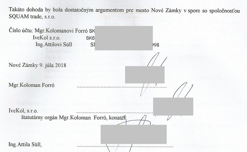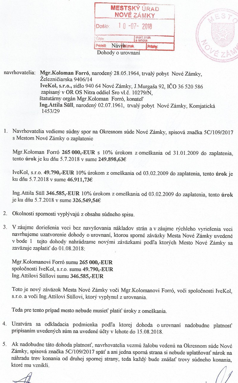 dnes dňa 10.07.2018 som doručil na Mestský úrad Nové Zámky  Dohodu o urovnaní medzi mestom Nové Zámky a ing.Atilla Sull, IveKol s.r.o., Mgr.Koloman Forró.