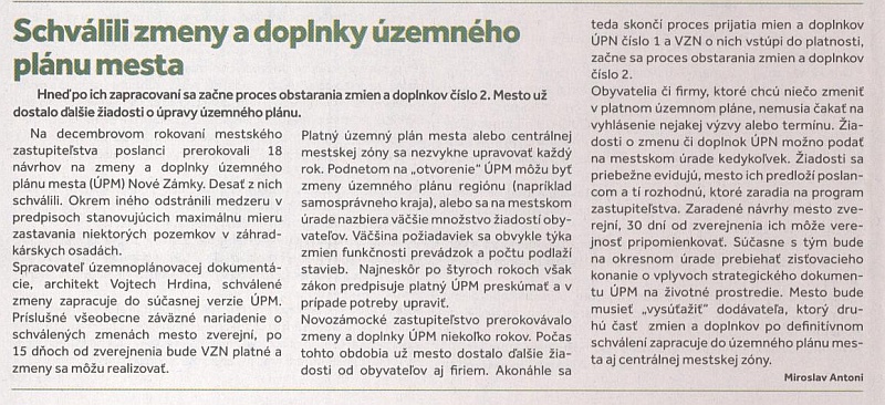 Mesto vydáva dvojtýždenník Castrum Novum z dôvodu že občan má právo byť informovaný a primátor znovuzvolený. Do novín zadarmo sa tradične balia šupky od zemiakov a možno si niektoré gazdinky všimli článok "Schválili zmeny a doplnky územného plánu". Autor, ako keby sa nechumelilo, hneď v druhej vete uvádza, že poslanci prerokovali 18 návrhov na zmeny ÚP a schválili 10 z nich. Ako?! 10 z 18? Veď tri roky sa o nich mohlo hlasovať iba v balíčku systémom Všetko alebo Nič! Vždy len v balíčku aj s primátorovými toxickými návrhmi! Opozičná 12-ka teda ustála roky obviňovania a útokov a ubránila záujmy Novozámčanov!