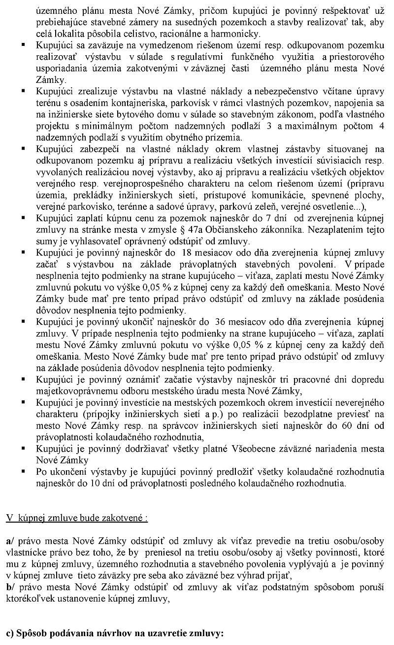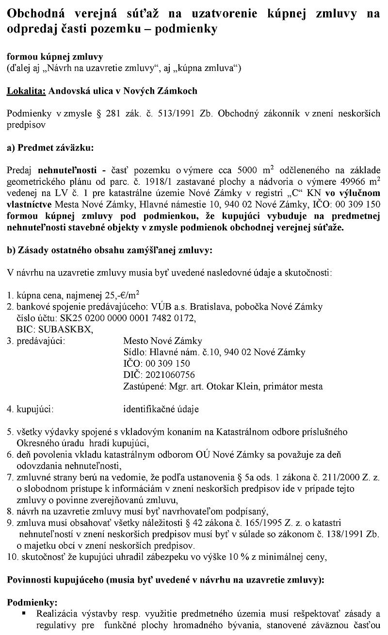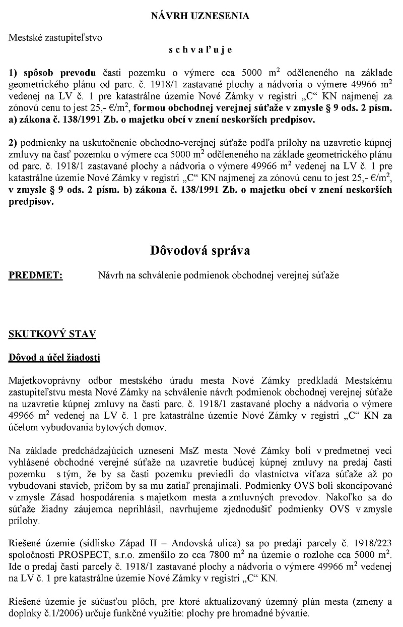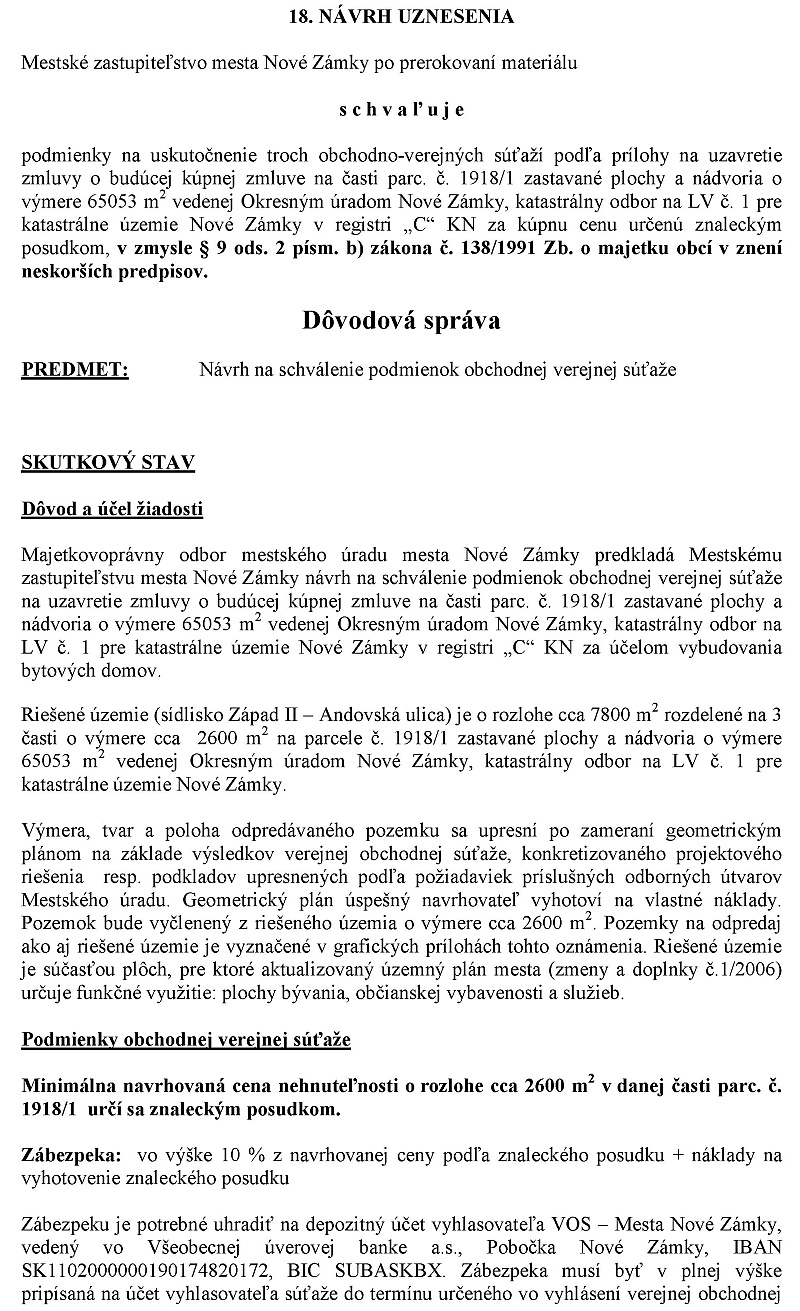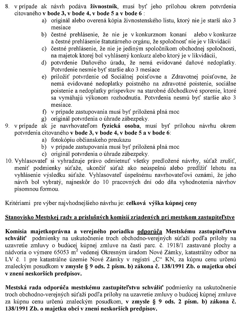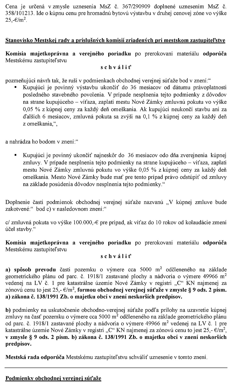 viceprimátor Štefánik: Mestské zastupiteľstvo schváluje podmienky na uskutočenie troch obchodno-verejných súťaží podľa prílohy na uzavretie zmovy o budúcej kúpnej zmluve na časti parcely číslo 1918 znamená jedna zastávané plochy a nádvoria o výmere 65 550 m2 vedenej Okresným úradom Nové zámky katastrálny odborn na liste vlastníctva číslo 1 pre katastrálne územie Nové Zámky registri CKN za kúpnu cenu určenú znaleckým posudkom v zmysle paragrafu 9 odsah 2 písmeno B zákona číslo 138/1991 zbierky o majetku obcí vznenie neskorších predpisov podľa predlohy.