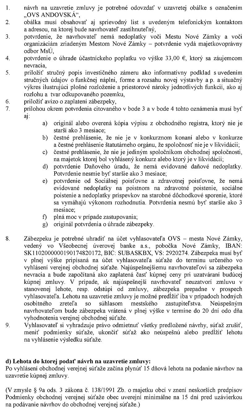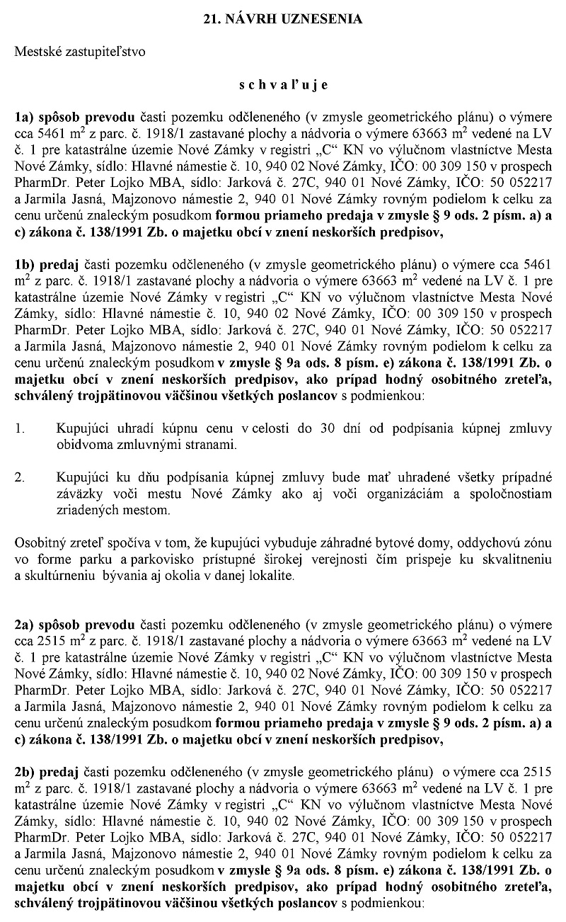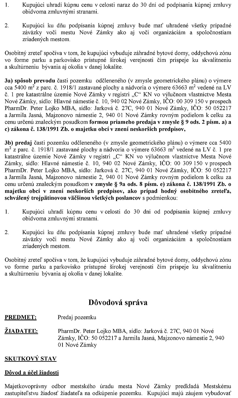 viceprimátor Štefánik: Návrh na uznesenie. Mestne zastupiteľstvo schváluje podmienky na uskutočenie troch obchodno-verejných súťaží podľa prílohy na uzavretie zmluvy o budúcej kúpnej zmluve. Na časti parcely číslo 1918/1 zastavané plochy a nádvoria o výmere 65 053 m2 vedenej okresným úradom Nové zámky. Katastrálny odbor na LV číslo 1 pre k.ú. Nové Zámky v registri CKN za kúpnú cenu určenú znaleckým posudkom v zmysle paragrafu 9.2 písmeno B zákona číslo 138 zlomené 1991 zbierky o majetku obcí vznenie neskôrších predpisov podľa predlohy s tým, že podľa pozmenujúceho návrhu zábezpeka na každý z tých týchto troch pozemkov sa určuje na 10 000 eur.