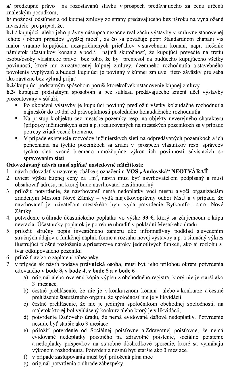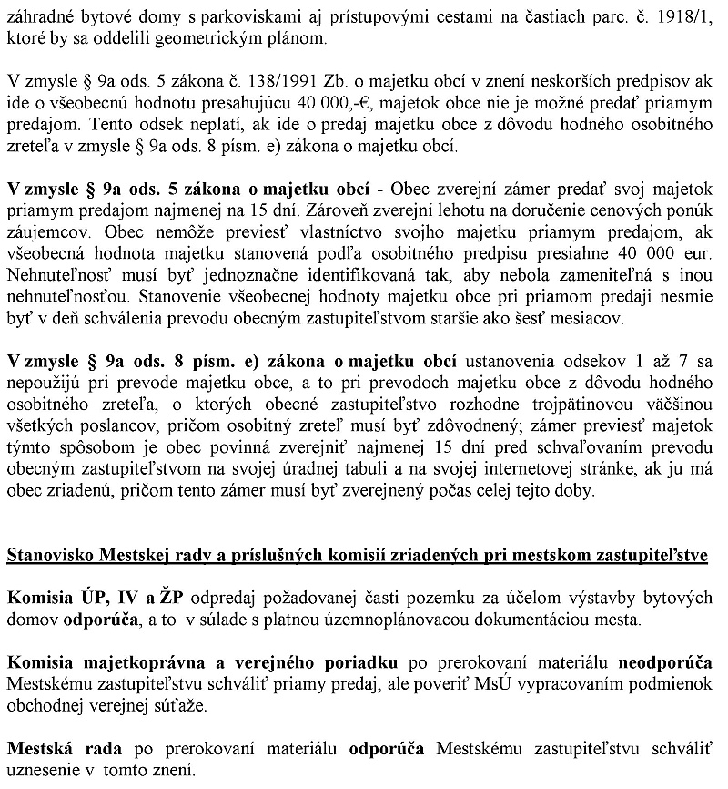 Zároveň sa zaväzujú vybudovať oddychovú zónu vo forme parku a parkovisko prístupné širokej verejnosti. Ak dovolíte ctené mestské zastupiteľstvo, včera bol na mestský úrad dorúčený list tohto žiadatela, ktorý na základe toho, že si naštudoval podmienky súťaže, na základe ktorých sa v tejto lokalite už predávali pozemky a navrhol cenu 18 euro za meter štvorcový. Z tohto dôvodu sme pristúpili k vypracovaniu podmienok obchodno-verejnej súťaže, ktoré vám boli doručené v prebiehu zasadnutia mestského zastupiteľstva.