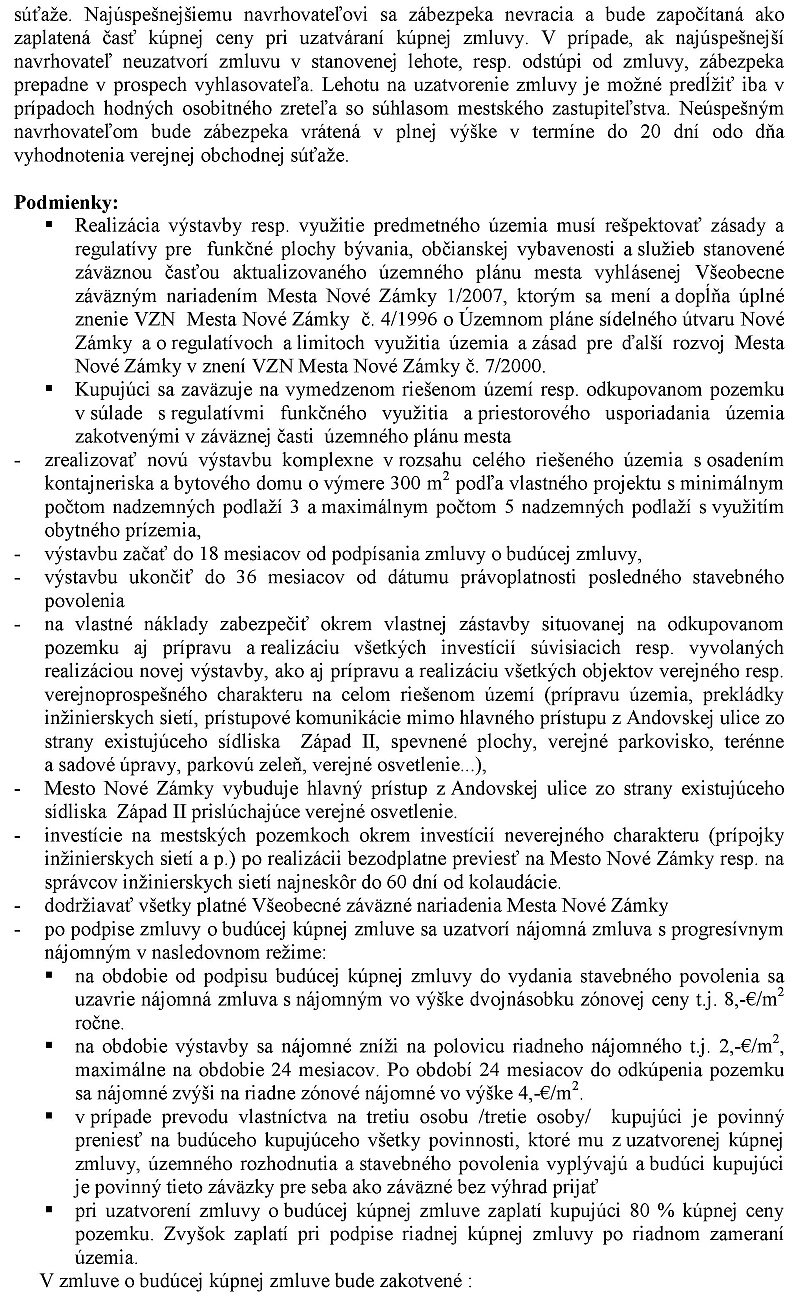 JUDr. Závodský: Majetkoprávny odbor Mestského úradu predkladá Mestskému zastupiteľstvu návrh na schválenie podmienok obchodnej verejnej súťaže na uzavretie zmluvy o budúcej kúpnej zmluve na parcele číslo 1918/1 zastavené plochy a nádvoria o výmere 65 053 m2 vedeným okresným úradom na liste vlastníctva 1 ako výlučné vlastníctvo mesta. Riešené územie - ide o sídlisko Západ 2 Andovská ulica - je o výmere 7 800 m2, ktoré navrhujeme rozdeliť na tri rovnomerné časti o výmere 2600 m2. Výmera tvar a poloha odpredávaného pozemku sa upresní po zameraní geometrickým plánom na základe výsledkov verejnej obchodnej súťaže, konkretizovaného projektového riešenia, respektíve podkladov upresnených podľa požiadaviek príslušných odborných útvaru mestskej úradu. Geometrický plán úspešný navrhovateľ vyhotoví na vlastné náklady. Pozemok bude vyčlenený z riešeného územia o výmere 2600 m2. Minimálnu navrhovanú cenu nehnuteľnosti navrhujeme určiť z naleckým posudkom.