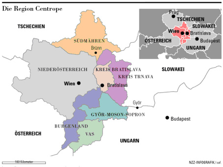 Dass nicht so einfach zusammenwächst, was zusammengehört, weiss man spätestens seit der deutschen Wieder-vereinigung. Noch viel schwerer hat es ein Reissbrettprojekt wie die «Region Centrope» (trotz gemeinsamer Vergangenheit in der Habsburgermonarchie) - vertritt doch dieses am Vorabend der EU-Osterweiterung für gemeinsames Standortmarketing gegründete Vehikel acht Regionen aus vier Ländern. Noch vor dem Anfang stand die 1995 von Niederösterreich, Wien und Burgenland ausgerufene «Vienna Region», die - um an der einsetzenden Dynamik teilzuhaben - um das tschechische Südmähren, die slowakischen Kreise Trnava und Bratislava sowie die ungarischen Komitate Györ-Moson-Sopron und Vas erweitert wurde. Die Addition der Wirtschaftsleistung der acht Regionen ergibt einen leistungsfähigen Wirtschaftsraum, doch um diesen mit Recht als «transnational» zu bezeichnen, fehlt es an der verbindenden Klammer bzw. der Eigendynamik von gemeinsamen Projekten.