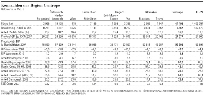 Von diesen hochtrabenden Zielen ist die Region Centrope mit ihren (addierten) 6,6 Mio. Einwohnern auf 44 500 Quadratkilometern noch weit entfernt; auch wenn die Region - vor allem dank der tschechischen und slowakischen Dynamik - stärker wächst als die EU-27 (und auch in der Krise der Einbruch weniger stark war). Laut dem im März 2011 vorgelegten «Centrope Regional Development Report» lag das Pro-Kopf-BIP vor der Krise (Kaufkraftstandard) mit etwa 27 000 € um 11% über dem EU-Schnitt. Dabei übertrafen die Hauptstadtregionen Wien und Bratislava mit jeweils rund 40 000 € den Centrope-Schnitt um knapp 50%, während Niederösterreich etwa im EU-27-Schnitt lag. Die anderen Regionen - von Trnava mit 20 402 € bis zum Schlusslicht Vas mit 14 649 € - sind davon noch um einiges entfernt. Zahlen (noch dazu vergleichbare) für die Regionen selbst sind schwer zu erhalten, deshalb stammen etliche dieser Kennzahlen in der Tabelle aus der Zeit unmittelbar vor der Krise, womit sie aber wieder einigermassen heutigen Werten entsprechen dürften.