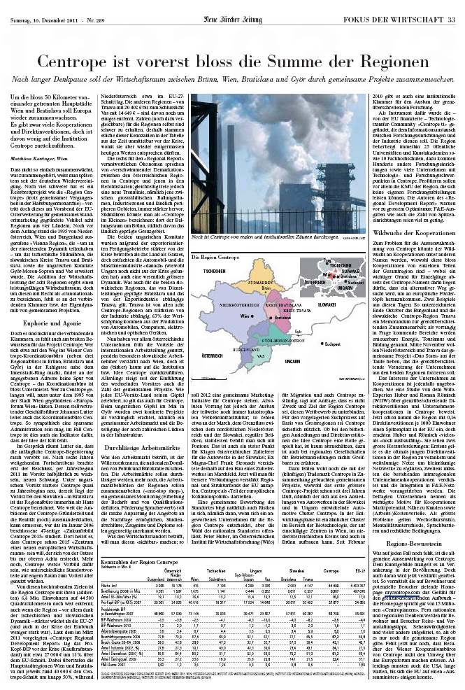 Neue Zürcher Zeitung: Centrope zatiaľ neznamená viac, než spoločenstvo regiónov / A Centrope egyelőre nem egyéb, mint a régiók összessége
