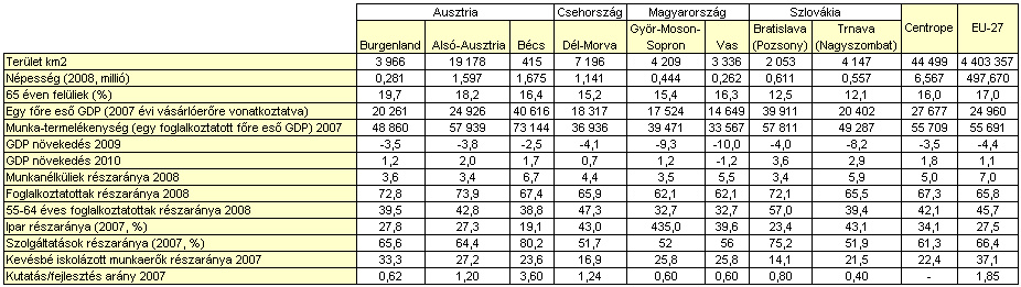 Ezektől a magasröptű céloktól a Centrope régió a 44 500 négyzetkilométeren összesen 6,6 millió lakosával még messze el van maradva; még akkor is, ha figyelembe vesszük, hogy a térség – mindenekelőtt a cseh és a szlovák fellendülésnek köszönhetően – nagyobb iramban gyarapszik, mint az EU-27 (és a krízis is kevésbé sújtotta). A „Beszámoló a Centrope regionális fejlődéséről” 2011 márciusában kiadott közlemény szerint a krízis előtti egy főre eső nemzeti össztermelés (a vásárlóerő vonatkoztatási alapja) 27 000 € volt, ez 11%-kal volt magasabb az EU-átlagnál. Ugyanakkor a Bécs és Bratislava fővárosok és környékére érvényes 40 000 €, 50%-kal haladta meg a Centrope -átlagot, míg Alsó-Ausztria körülbelül az EU-27 átlagának szintjén mozgott. A többi régió ennek (24 324 €) még lényegesen alatta marad – Trnava 20 402 €-val vezet, Vas 14 649 €-val az utolsó helyen áll. Az egyes régiók számadataihoz (különösen egymással összehasonlítható adatokhoz) nehéz hozzájutni, ezért a táblázat összes adata a krízis előtti időből való. Ezek viszont körülbelül megfelelnek a mai értékeknek.