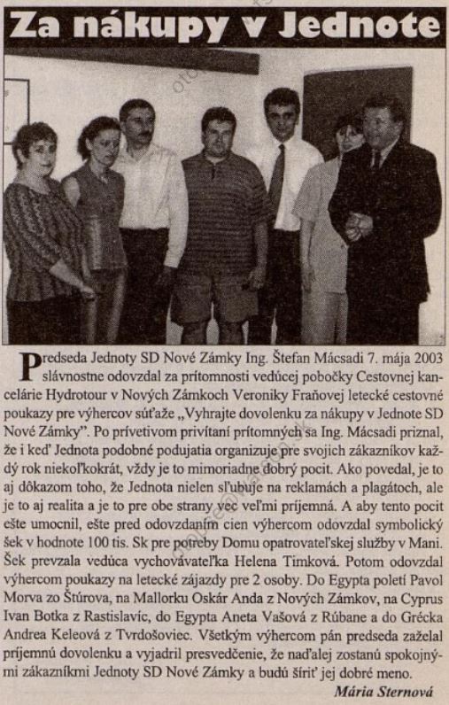2003.05.20 | Castrum Novum: Predseda Jednoty SD Nové Zámky Ing. Štefan Mácsadi slávnostne odovzdal letecké cestovné poukazy pre výhercov súťaže „Vyhrajte dovolenku za nákupy v Jednote SD Nové Zámky” Článok |