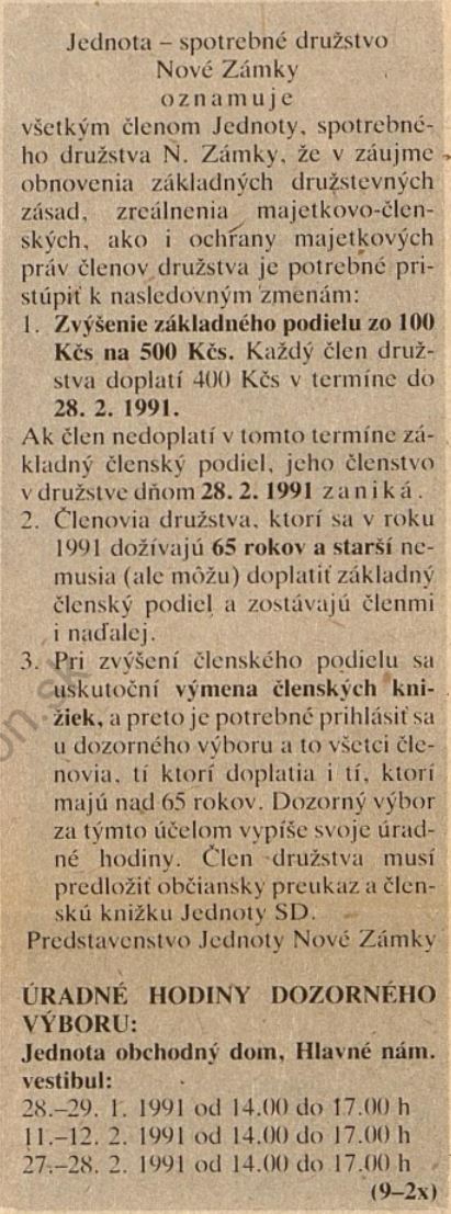 1991.01.14 | Naše novosti: Oznámenie všetkým členom Jednoty o zvýšení základného podielu zo 100 Kčs na 500 Kčs v termíne do 28. 2. 1991 a o zániku členstva v opačnom prípade Článok |