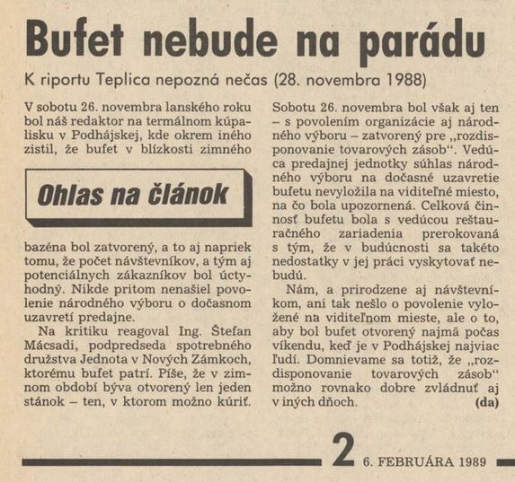 1989.02.06 | Pravda: Bufet nebude na parádu. K riportu Teplica nepozná nečas (28. novembra 1988) Článok |