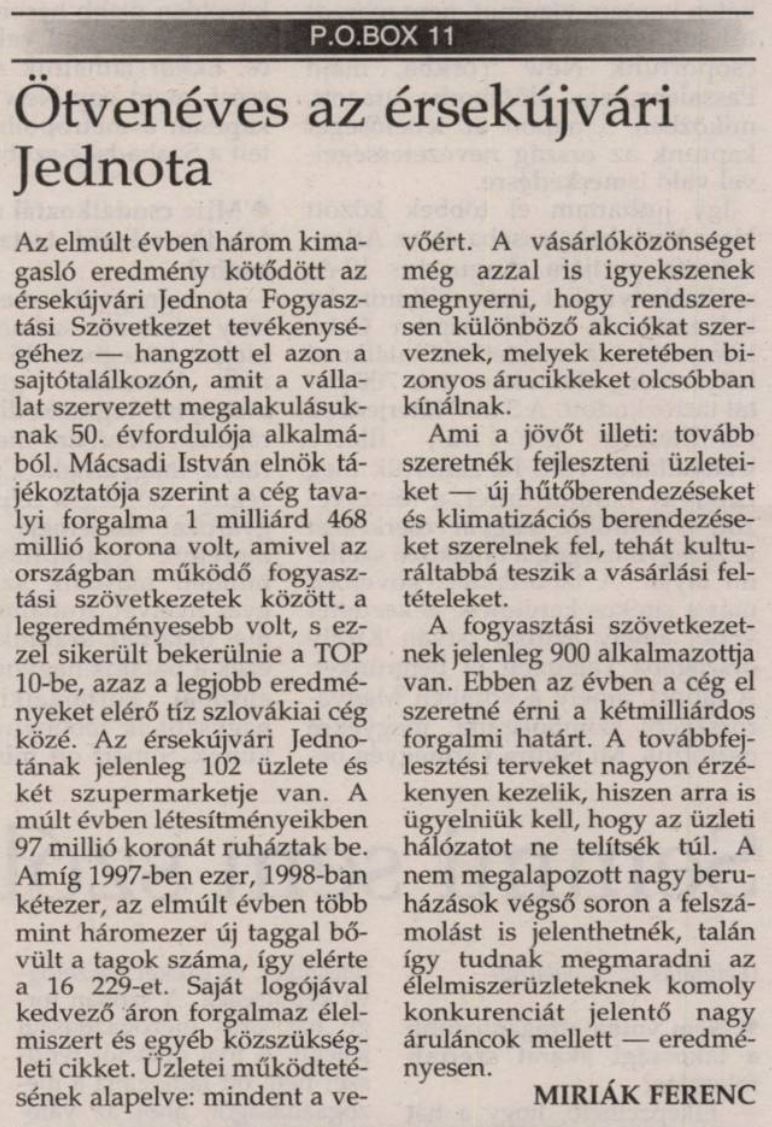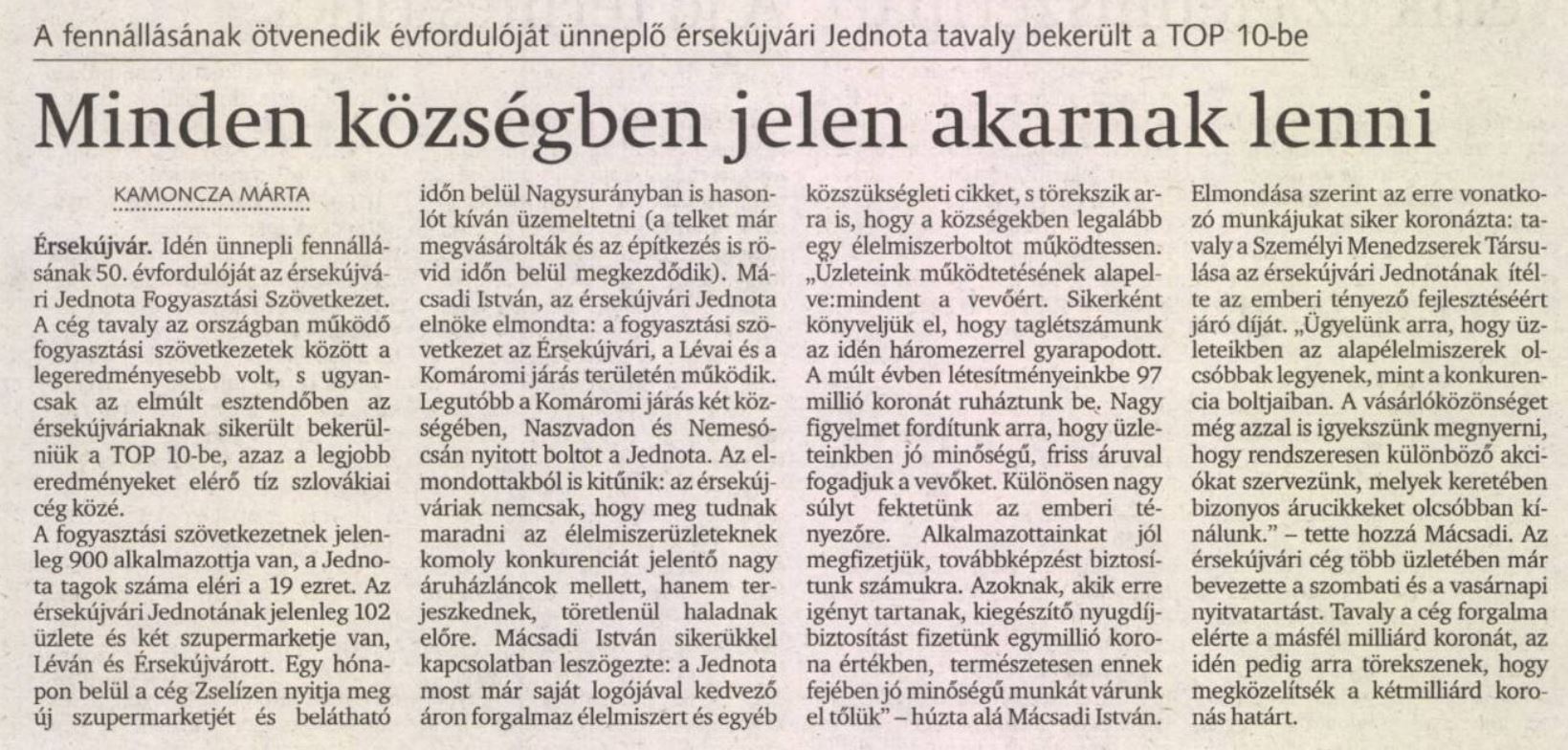 2000.10.11 | Új Szó: Minden községben jelen akarnak lenni. A fennállásának ötvenedik évfordulóját ünneplő érsekújvári Jednota tavaly bekerült a TOP 10-be Cikk |