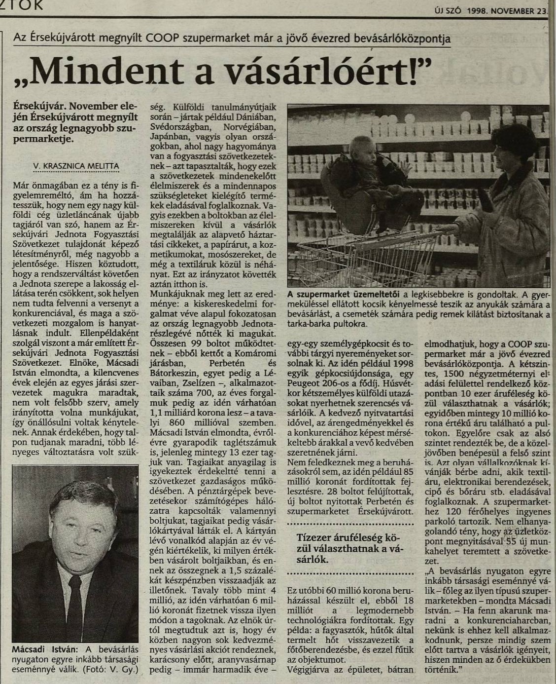 1998.11.23 | Új Szó: Az Érsekújváron megnyílt COOP szupermarket már a jövő évezred bevásárlóközpontja. „Mindent a vásárlóért!” Cikk |