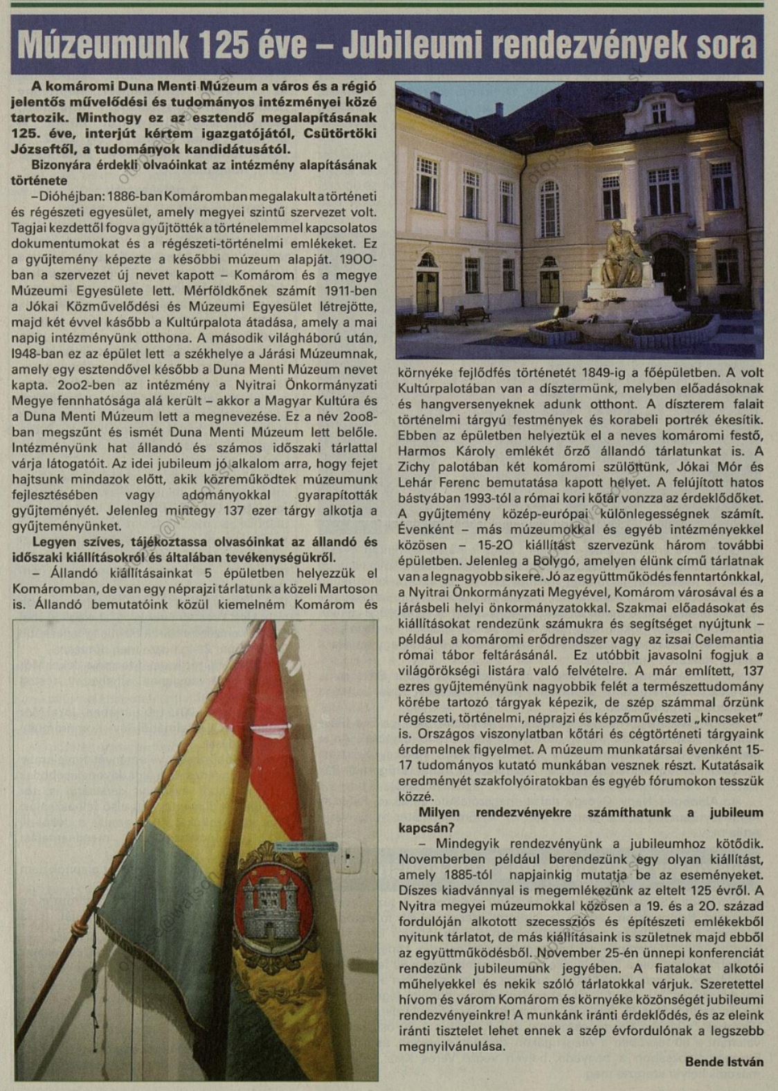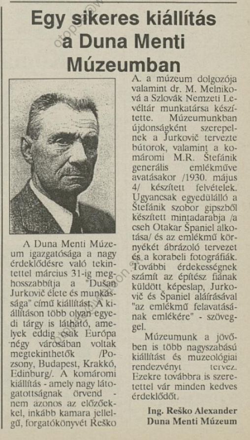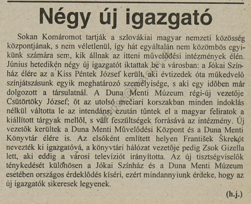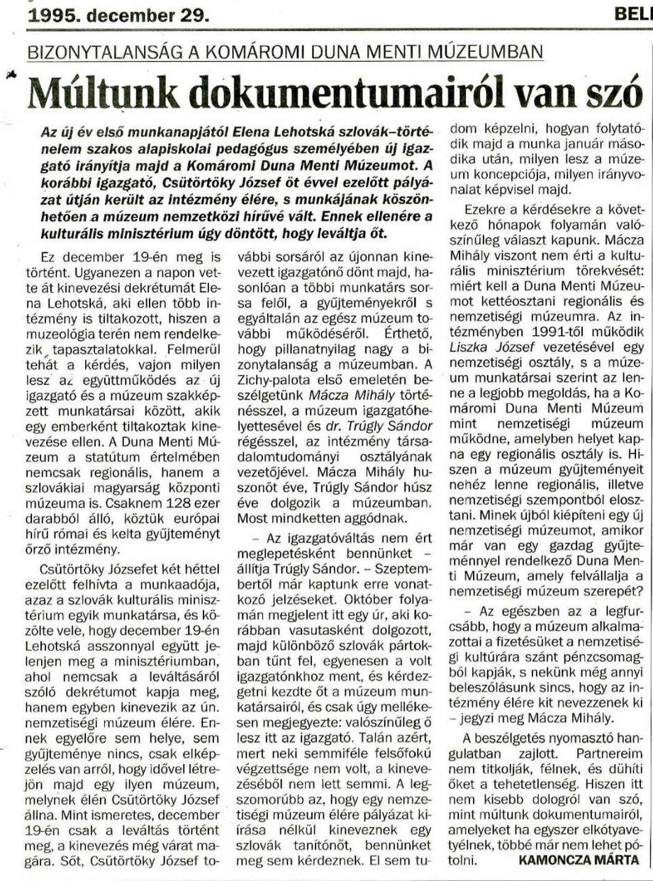 1995.12.29 | Új Szó: Múltunk dokumentumairól van szó. Az új év első munkanapjától Elena Lehotská szlovák-történelem szakos alapiskolai pedagógus személyében új Igazgató irányítja majd a Komáromi Duna Menti Múzeumot. A korábbi igazgató, Csütörtöky József öt évvel ezelőtt pályázat útján került az Intézmény élére, s munkájának köszönhetően a múzeum nemzetközi hírűvé vált Ennek ellenére a kulturális minisztérium úgy döntött, hogy leváltja őt. Cikk |