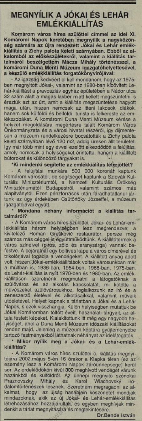 2002.04.26 | Komáromi lapok: Megnyílik a Jókai és Lehár emlékkiállítás Cíkk |
