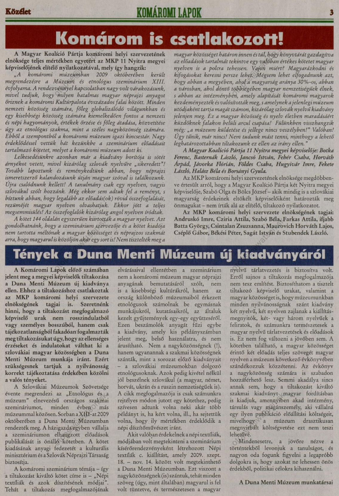 2010.02.10 | Komáromi lapok: Komárom is csatlakozott! Tiltakozás a múzeum egyik eghynyelvü kiadványa ellen. Cikk |
