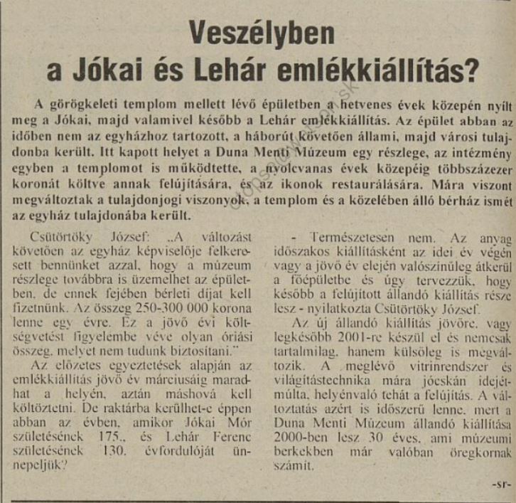 1999.08.06 | Komáromi lapok: Veszélyben a Jókai és Lehár emlékkiállítás? Cikk |