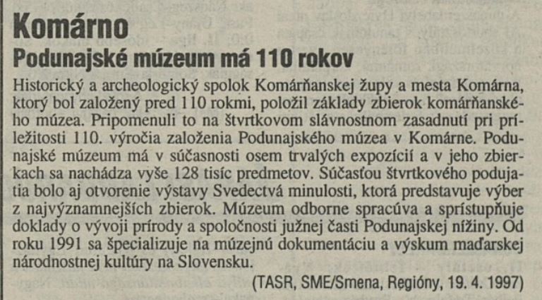 1997.04.19 | ZASR: Komárno. Podunajské múzeum má 110 rokov Článok |