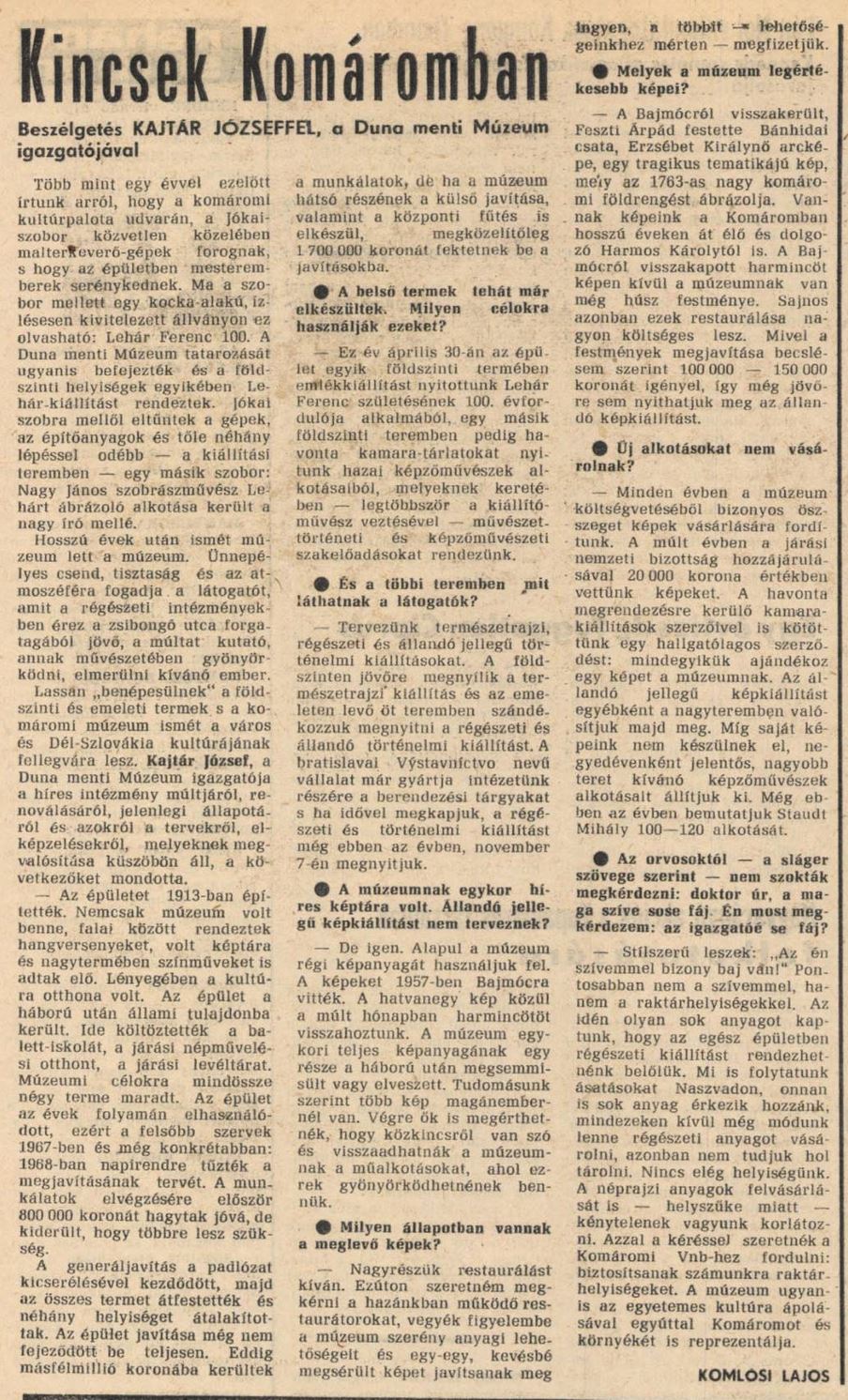 1970.08.19 | Új Szó: Kincsek Komáromban. Beszélgetés KAJTÁR JÓZSEFFEL, a Duna menti Múzeum igazgatójával Cikk |
