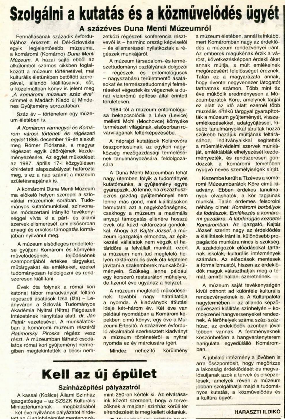1987.01.08 | Új Szó: Szolgálni a kutatás és a közművelődés ügyét. A százéves Duna Menti Múzeumról Cikk |