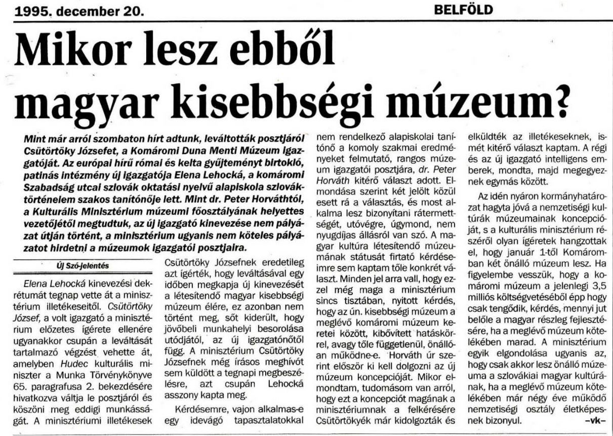 1995.12.20 | Új Szó: Mikor lesz ebből magyar kisebbségi múzeum? Leváltották posztjáról Csütörtöky Józsefet, a Komáromi Duna Menti Múzeum Igazgatóját. Az európai hírű római és kelta gyűjteményt birtokló, patinás Intézmény új Igazgatója Elena Lehocká, a komáromi Szabadság utcai szlovák oktatási nyelvű alapiskola szlováktörténelem szakos tanítónője lett. Cikk |