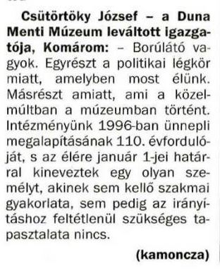1999.06.11 | Komáromi lapok: Négy új igazgató. Június hetedikén négy új igazgatót iktattak be a városban, köztük a Duna Menti Múzeum régi-új vezetője Csütörtöky Józsefet; öt az utolsó meőiari korszakban minden indoklás nélkül váltotta le az intendáns; ezután tűntek el a magyar feliratok a kiállított tárgyak mellől, s váll feszültségek forrásává az intézmény. Cikk |
