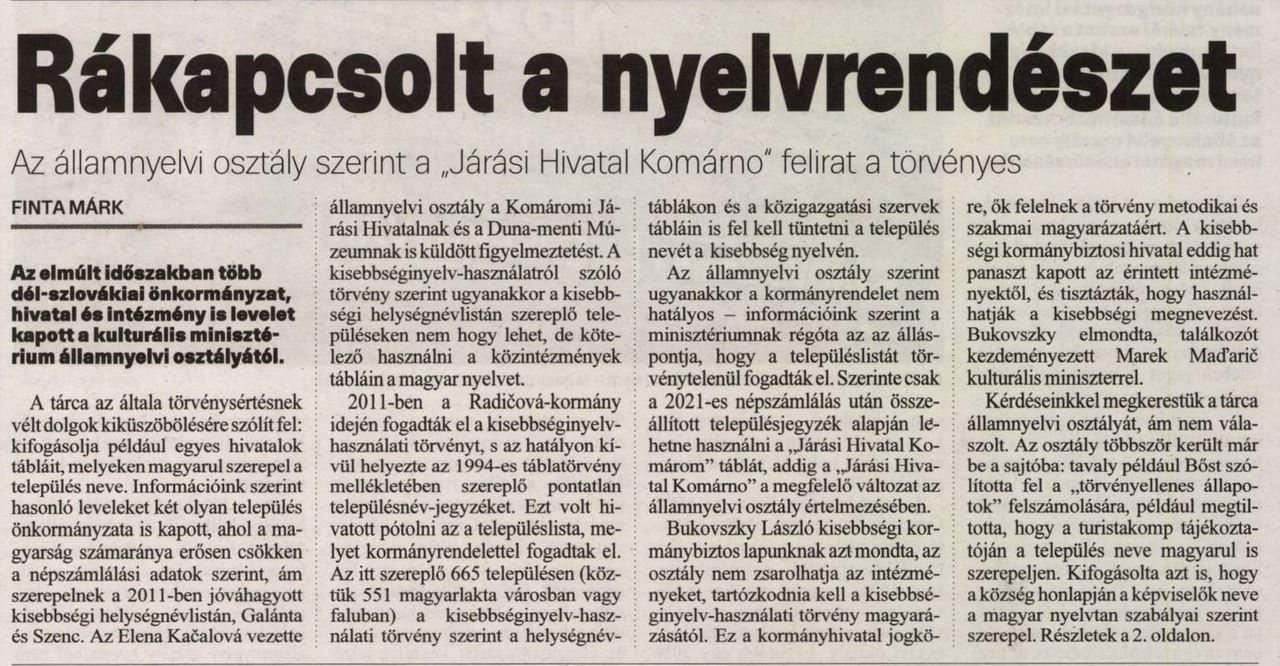 2017.09.16 | Új Szó: Rákapcsolt a nyelvrendészet. Az államnyelvi osztály szerint a „Járási Hivatal Komárno" felirat a törvényes Cikk |