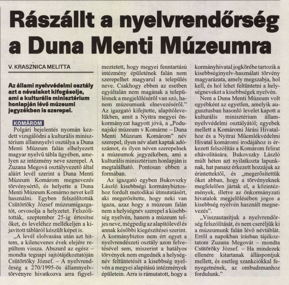 2017.09.20 | ÚJj Szó: Rászállt a nyelvrendőrség a Duna Menti Múzeumra Cikk |
