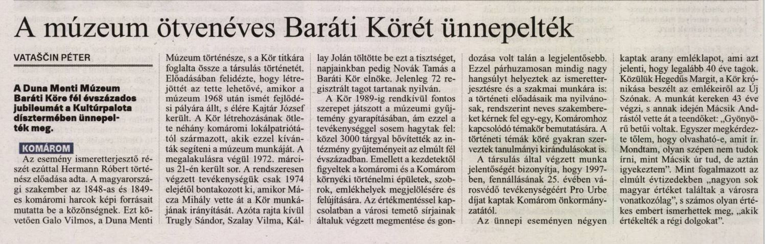 2022.10.22 | Új Szó: Az emlékek őrei. 50 éves a komáromi Duna Menti Múzeum Baráti Köre Cikk |