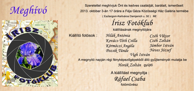 Szeretettel meghívjuk Önt és kedves családját, barátait, ismerőseit 2013. október 3-án 17 órára a Féja Géza Közösségi Ház Galéria termébe (Esztergom-ketrváros, Damjanich u. 50.) az ÍRISZ FOTÓKLUB kiállításának megnyitójára.