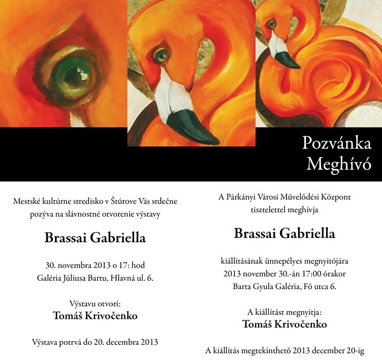 November 30-án 17 órakor a Párkányi Művelődési Ház tisztelettel meghívja a Barta Gyula galériában rendezett Brassai Gabriella festő- és grafikusművész tárlatára. A kiállítást megnyitja Tomáš Krivocenko. Az esztergomi alkotó képeit december 20-áig lehet majd megtekinteni a párkányi Galériában.