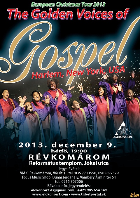 Az idén az Elokoncert szervezésében újból szlovákiai koncert körútra látogat The Golden Voices of Gospel hangszeres énekegyüttes. A zene szerelmesei több helyszínen is élvezhetik a szuper-csapat produkcióját. A 7 koncertből álló turné első állomásaként 2013. december 9-én este 19.00 órai kezdettel Révkomárom-i Református Templomban koncertezik a The Golden Voices of Gospel.