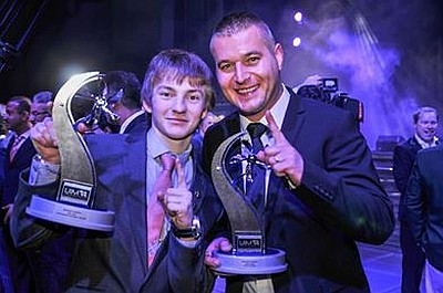 A dunaújvárosi világbajnok, Tábori Áron (balról) és a szintén világbajnok, párkány Hencz Róbert Monacóban az eredményeikért kapott trófeákkal ,– ritka kitüntetéssel.