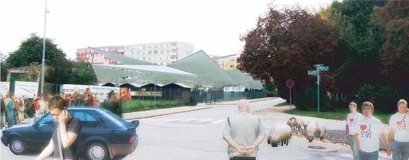 Priestor, ktorý každý pozná a kde každý každého pozná. Navrhujeme zvýšiť atraktivitu tohto výnimočného útvaru zastrešením celej plochy trhoviska ľahkou oceľovou konštrukciou, ktorá nemá ovplyvniť pozíciu a fungovanie trhu, ale vytvoriť trh vyššieho štandardu, multifunkčný trh s pridanou hodnotou. V návrhu pracujeme so symbolikou stromu/zhluku stromov. Strom ako tradičný symbol ochrany pre človeka pred rôznymi vplyvmi. Strom sme vyabstrahovali do formy priestorovej konštrukcie, ktorá je vytvorená "kmeňom" - subtílne oceľové podporné stĺpy v abstraktnom tvare kmeňa stromu s konármi a "korunou"- ľahkou oceľovou trojuholníkovou strieškou v naklonenej rovine.